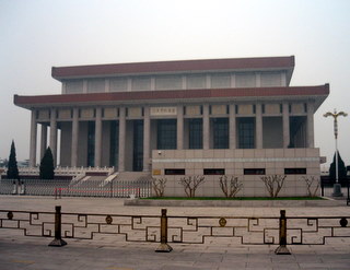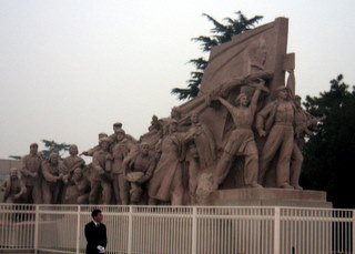 La place Tian an Men nous occupe déjà un moment. Plus que de "Place", on devrait parler de "Quartier" Tian an Men tant c'est immense (40 hectares). A titre indicatif, cela correspond plus ou moins à la superficie du cimetière du père lachaise à Paris ou à celle du Vatican. Sur cette place, le lieu numéro 1 pour la photo souvenir, c'est à côté de la photo de Mao. On a pas pu y échapper..... L'immense photo de Mao correspond à l'entrée de la Cité interdite (on y reviendra). De l'autre côté de la place se trouve le Mausolée de Mao. Les curieux peuvent rentrer. L'attente est longue: 1h30. La présence dans le sanctuaire l'est moins. Après 22 secondes, les gc (gardes communistes) nous demandent de quitter les lieux. Ceci est valable pour tous, pas seulement les opposants... Sur la place, on est impressionné aussi par le monument aux soldats chinois combattant durant la seconde guerre mondiale.