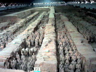 Xian se nommait autrefois Chang an et était la capitale des empereurs Tang. A l'epoque, c'etait la ville la plus importante au monde avec 2 millions d'habitants. C'est ici que 9 siècles auparavant l'Empereur avait décidé d'etablir son tombeau. Il etait prevoyant le garçon puisqu'il avait seulement 13 ans au début des travaux. A l'epoque, le tombeau de l'empereur devait ressembler au monde terrestre (lacs, terre, ciel). L'empereur décédé etait accompagné dans le tombeau par ces serviteurs et ceux qu'il aimait. Avec un peu de chance, l'imperatrice avait droit à la "mort accordee". Lors des funérailles et son entrée dans le tombeau pour accompagner son defunt mari, l'imperatrice pouvait porter une echarpe de soie. C'est avec cette echarpe de soie qu'elle pouvait se donner la mort lorsque les portes du tombeau se refermaient et qu'elle était enterrée vivante... Mais à Xian, on a une innovation majeure: les soldats. Constatant le nombre énorme de soldats souhaité par l'empereur pour protéger son tombeau: 7000, l'architecte en charge des travaux decida de realiser des soldats en terre cuite. Ces soldats furent redecouverts seulement en 1974. Le paysan etait en train de creuser un puits. En descendant au fond de ce puits il a decouvert des vestiges et a informé les autorités. Attention, depuis la redecouverte du site, on a decouvert seulement 20 soldats intacts. L'immense majorité a été detruite par eboulement. Depuis plus de 30 ans maintenant, on restaure les soldats. Ils sont costauds les gaillards. Ils font tous plus de 1,80....