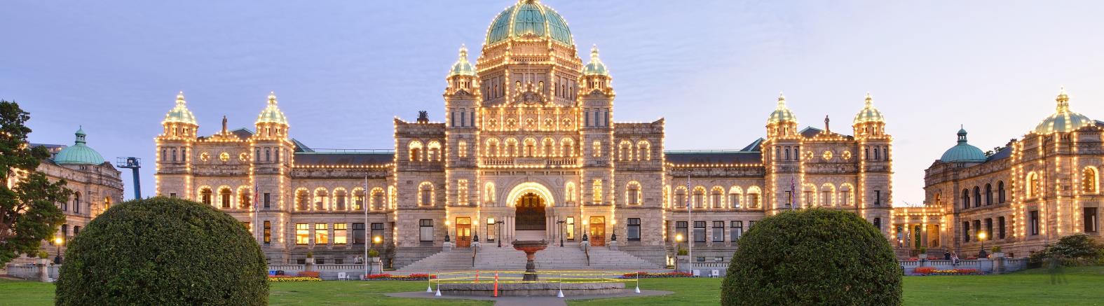 Ensuite, vous visiterez la ville de Victoria (65 000 habitants). Nommée ainsi pour rendre hommage à l’imperatrice Victoria. Encore aujourd'hui l'atmosphère est très British ! Victoria est la capitale de la province Colombie Britannique. C'est dans son superbe parlement que siège l'assemblée législative. Encore . Au sommet du dome, recouvert de cuivre, s’eleve une statue doree du capitaine George Vancouver.