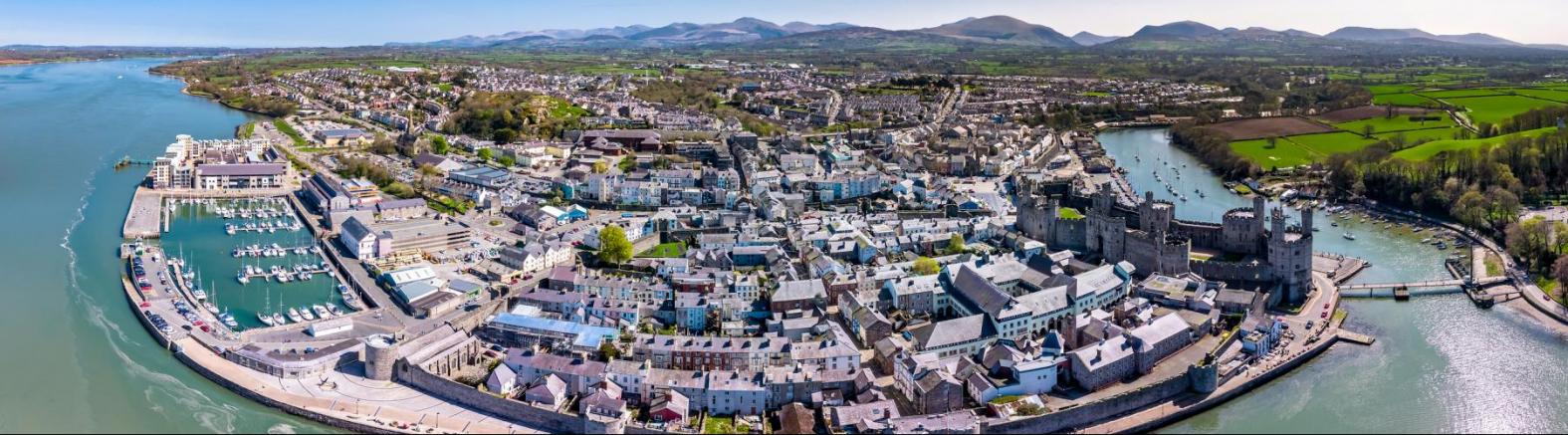 Caernarfon offre, du haut de ses remparts, de vastes vues sur l'île d'Anglesey et les collines du Snowdon.